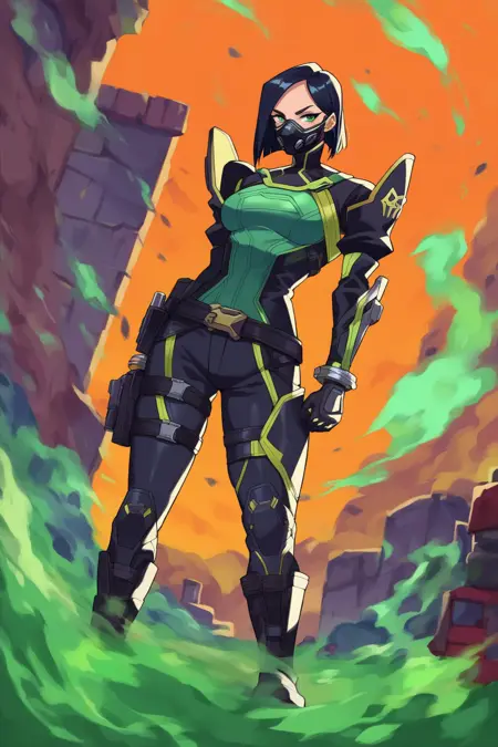 Prompts: Viper_Valorant, black hair, green eyes, green bodysuit, bob haircut, face mask, filtration mask, black mask, black shoulder plates, long black boots,