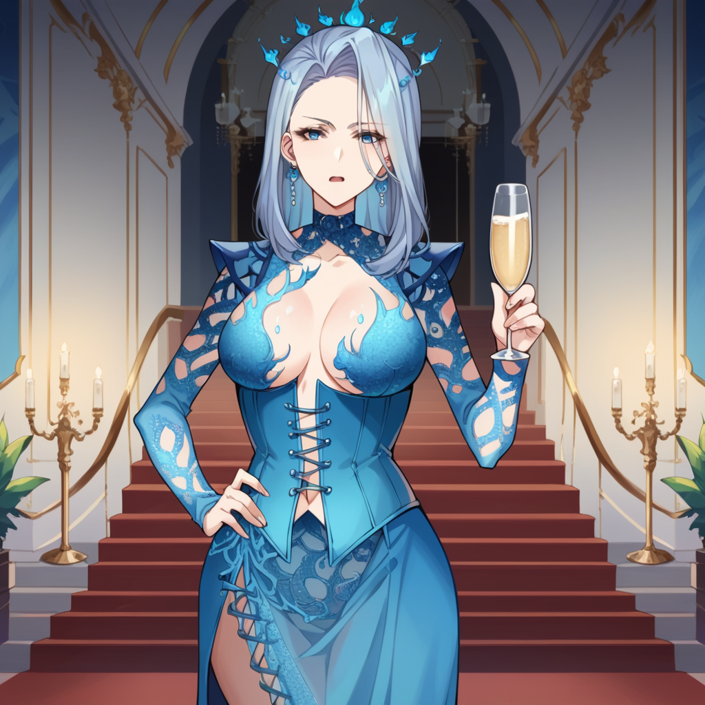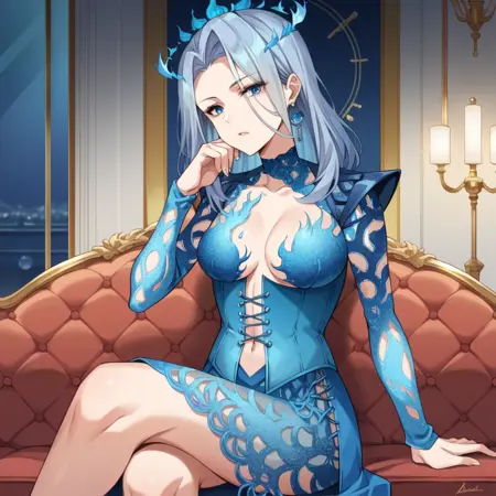 Amalee, Aml_2nd, long hair, blue eyes, blue hair, grey hair, halo behind head, dark blue dress, plunging neckline, gown, long dress, tattoo sleeves, glitter dress, blue sleeves, cleavage cutout, clothing cutout, blue crown, shoulder armor, cross-laced corset, blue corset, navel peek, long skirt, side slit, see-through skirt, blue skirt, turtleneck, alt jewelry, blue earrings, print dress,