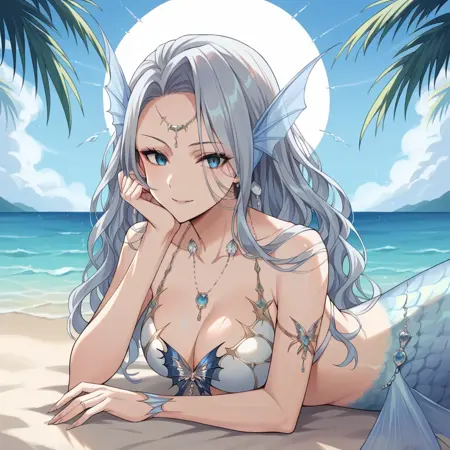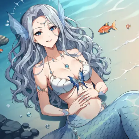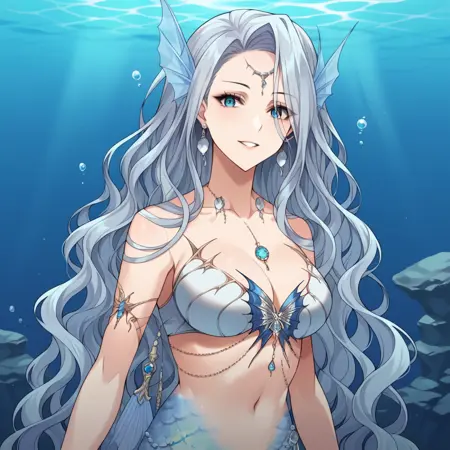 Form_v3, wavy hair, jewelry, gem, mermaid, mermaid tail, swimsuit, navel, bare shoulders, white bikini, bikini top only, cleavage, earrings, necklace, collarbone, fingernails, head fins, scales, armlet, midriff,