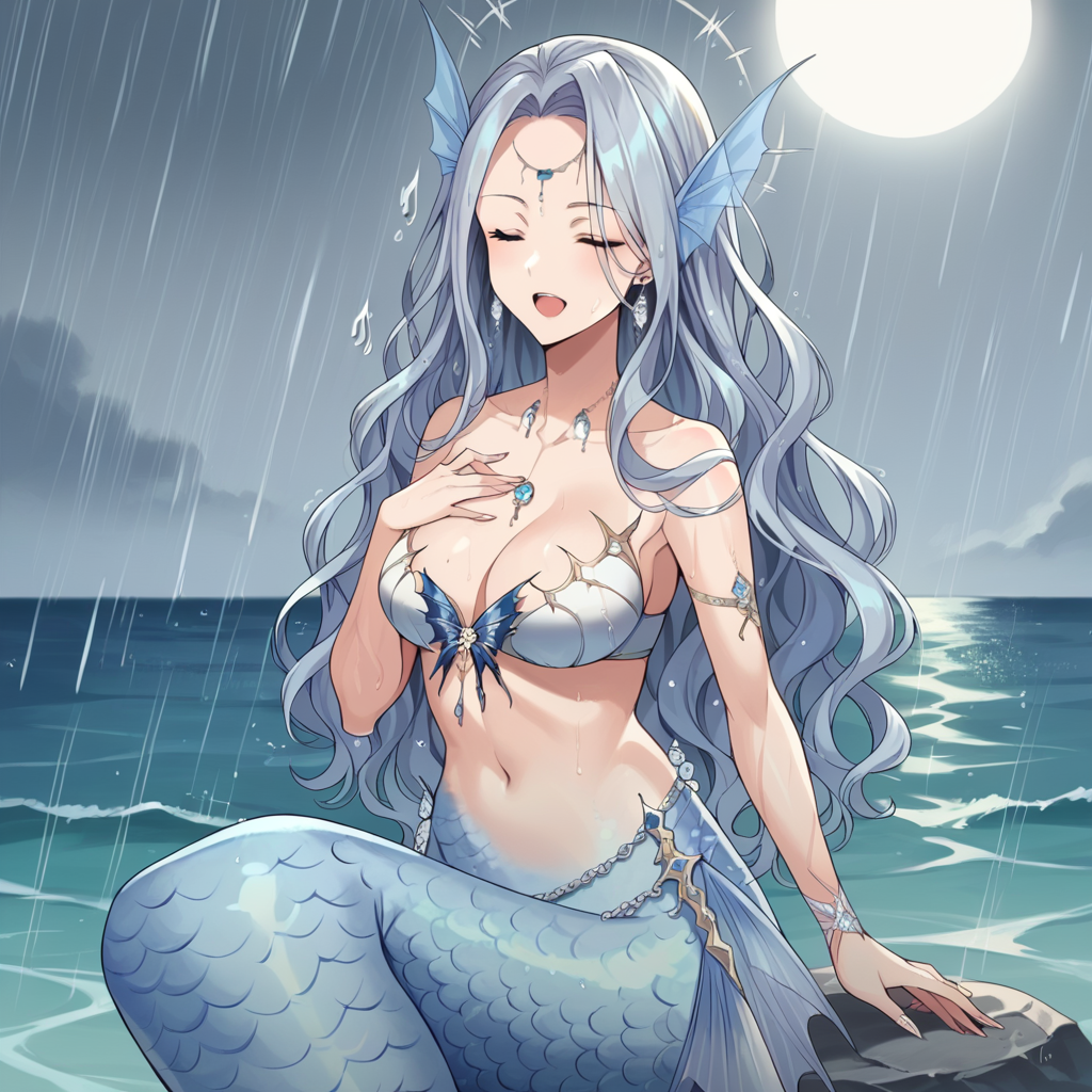 Amalee, Aml_3rd, very long hair, blue eyes, blue hair, grey hair, halo behind head, wavy hair, circlet, gem, butterfly ornament, forehead jewel, pearl bracelet, head fins, mermaid, mermaid tail, pendant, alternate jewelry, bare shoulders, white bikini, bikini top only, cleavage, butterfly earrings, armlet, butterfly choker, pearl (gemstone), blue gemstone, fingernails, dagger,
