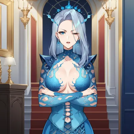 Form_v2, blue dress, tattoo sleeves, blue sleeves, cleavage cutout, clothing cutout, blue crown, blue hair, shoulder armor, cross-laced clothes, blue corset, navel peek, long skirt, side slit, see-through skirt, blue skirt, turtleneck, jewelry, earrings, collarbone, print dress,