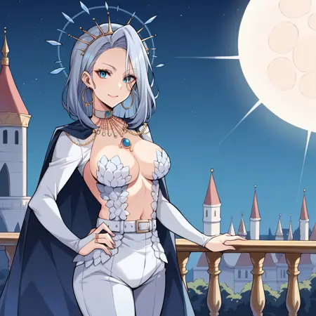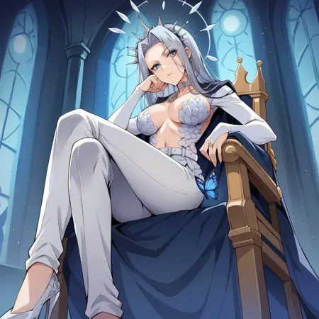Disclaimer: I've tried to make her cape look like butterfly wings as it should, but Ai would just make regular butterfly wings half of the time, so if you don't like the inconsistency, just remove "wing cape, blue cape, butterfly wings". They are at the end of the Prompt.