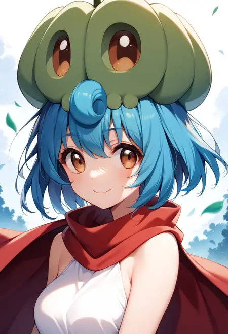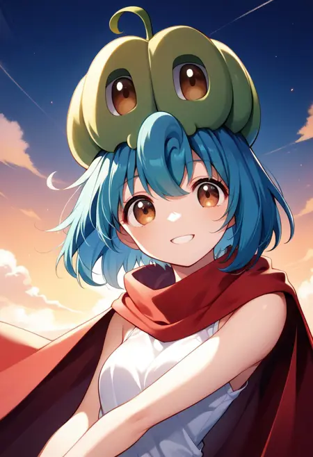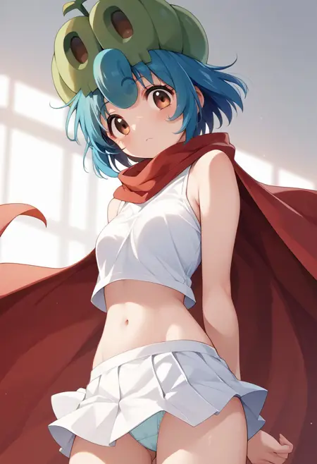 pampoojeny, blue hair, short hair, red cape, short skirt, panties, brown eyes, 1girl