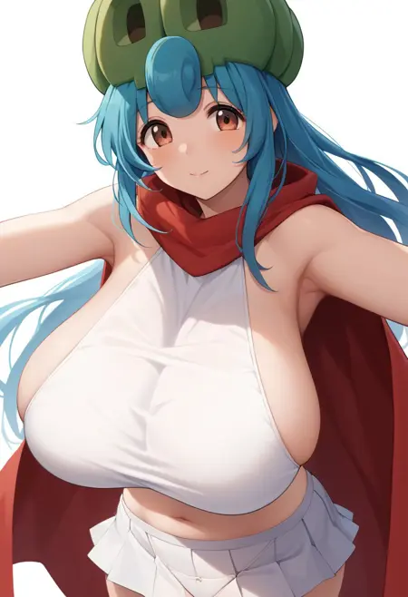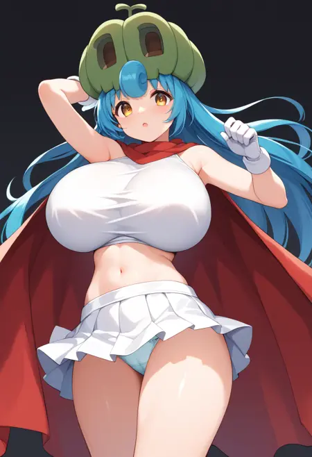 pampoojeny, blue hair, long hair, red cape, short skirt, panties, huge breasts, brown eyes, mature