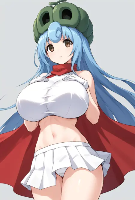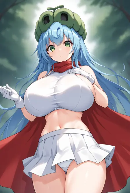 blue hair, long hair, red cape, short skirt, panties, huge breasts, brown eyes,