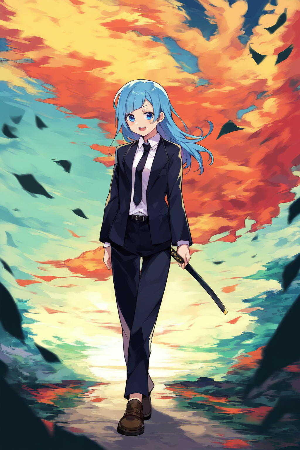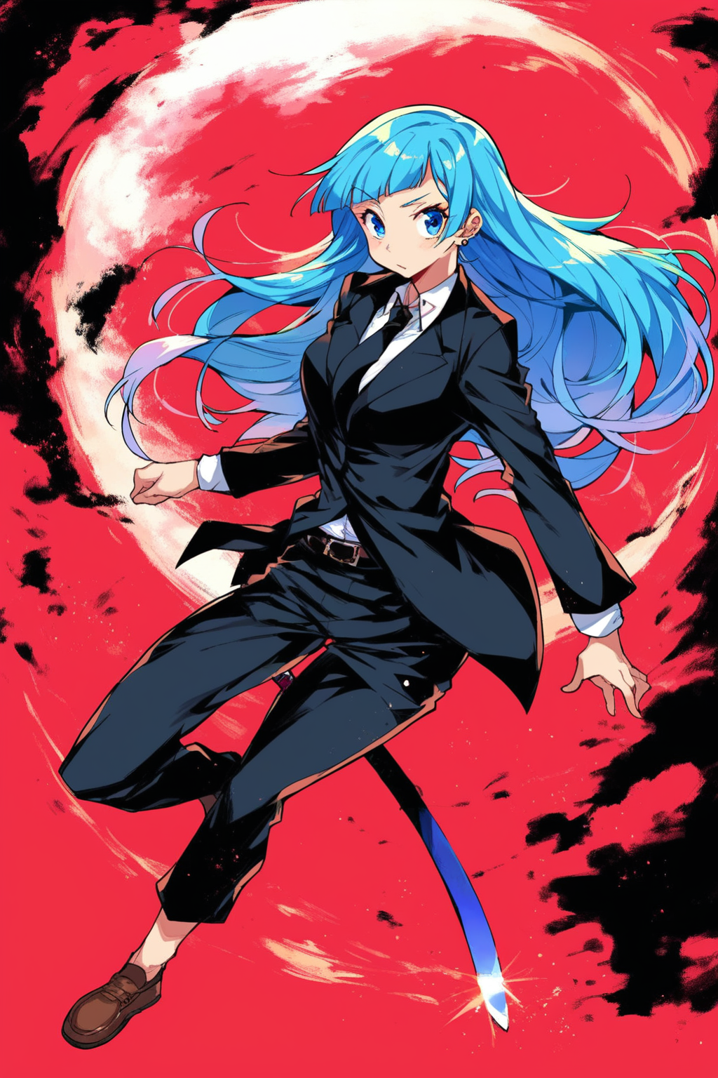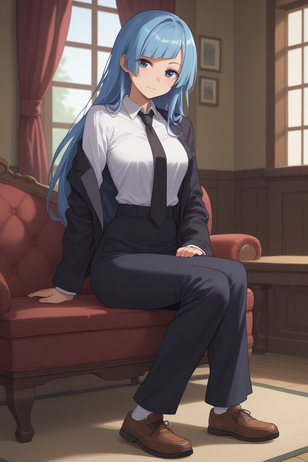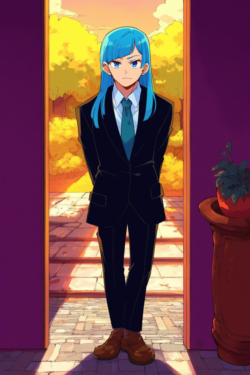 프롬프트: Miwa_JJK, 파란 머리카락, 넥타이, 카타나, 검은 정장, 남색 눈, 갈색 신발, 창백한 피부, 비대칭 앞머리, 긴 머리카락, 검은 넥타이,