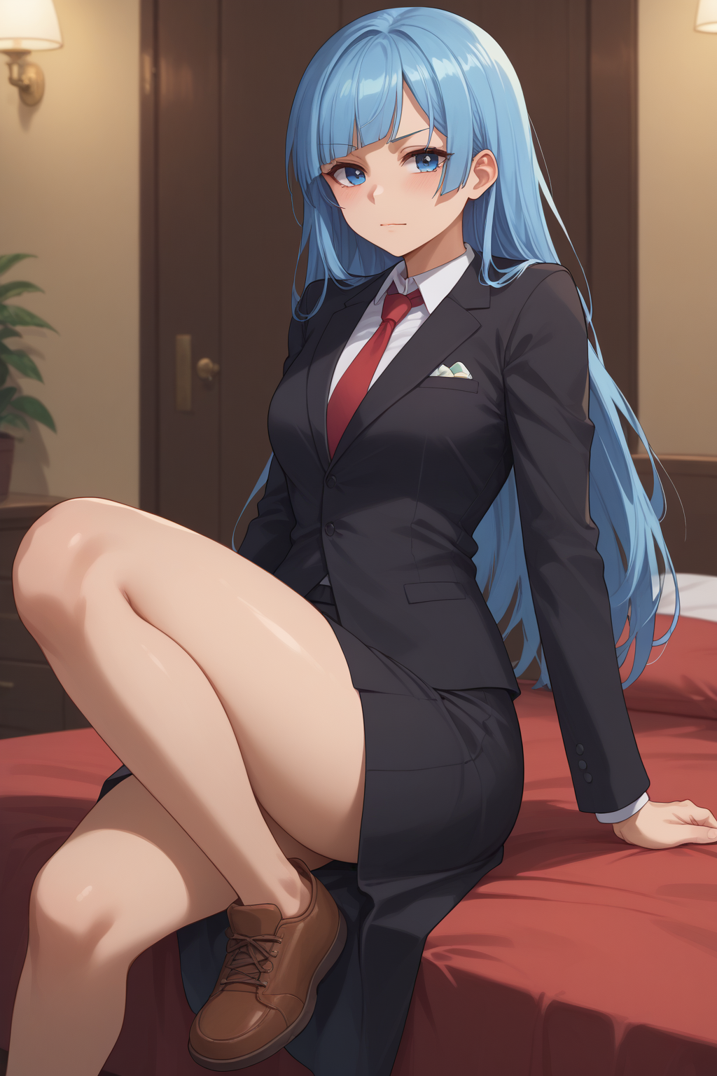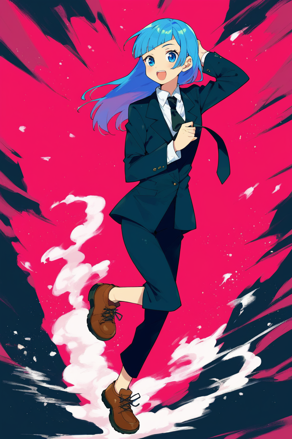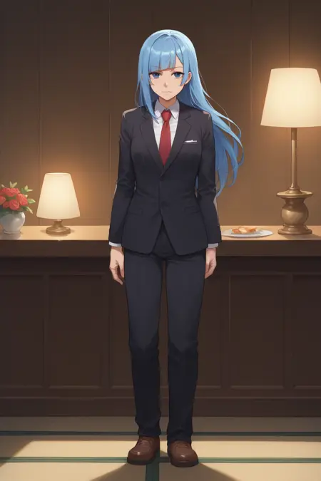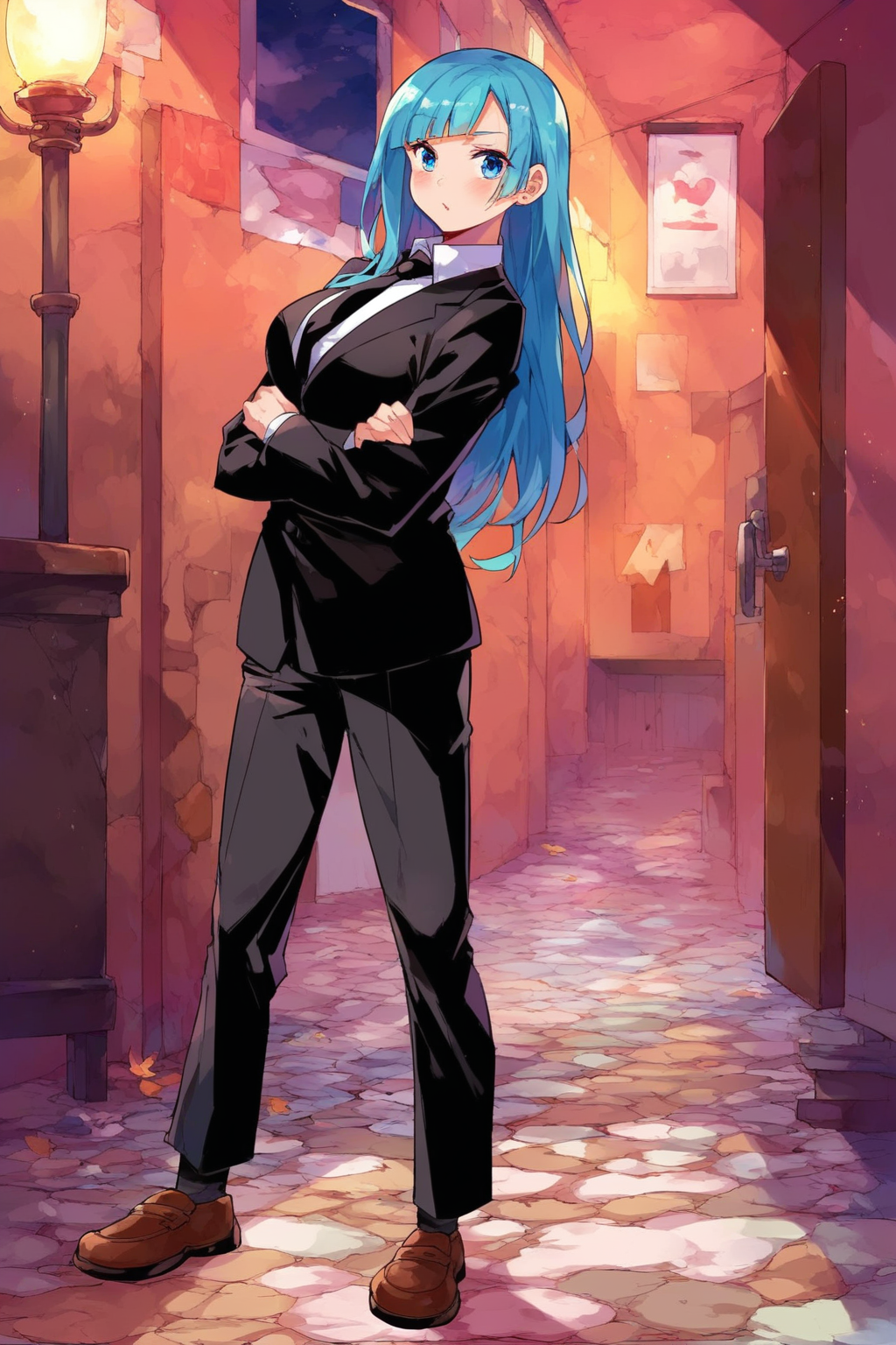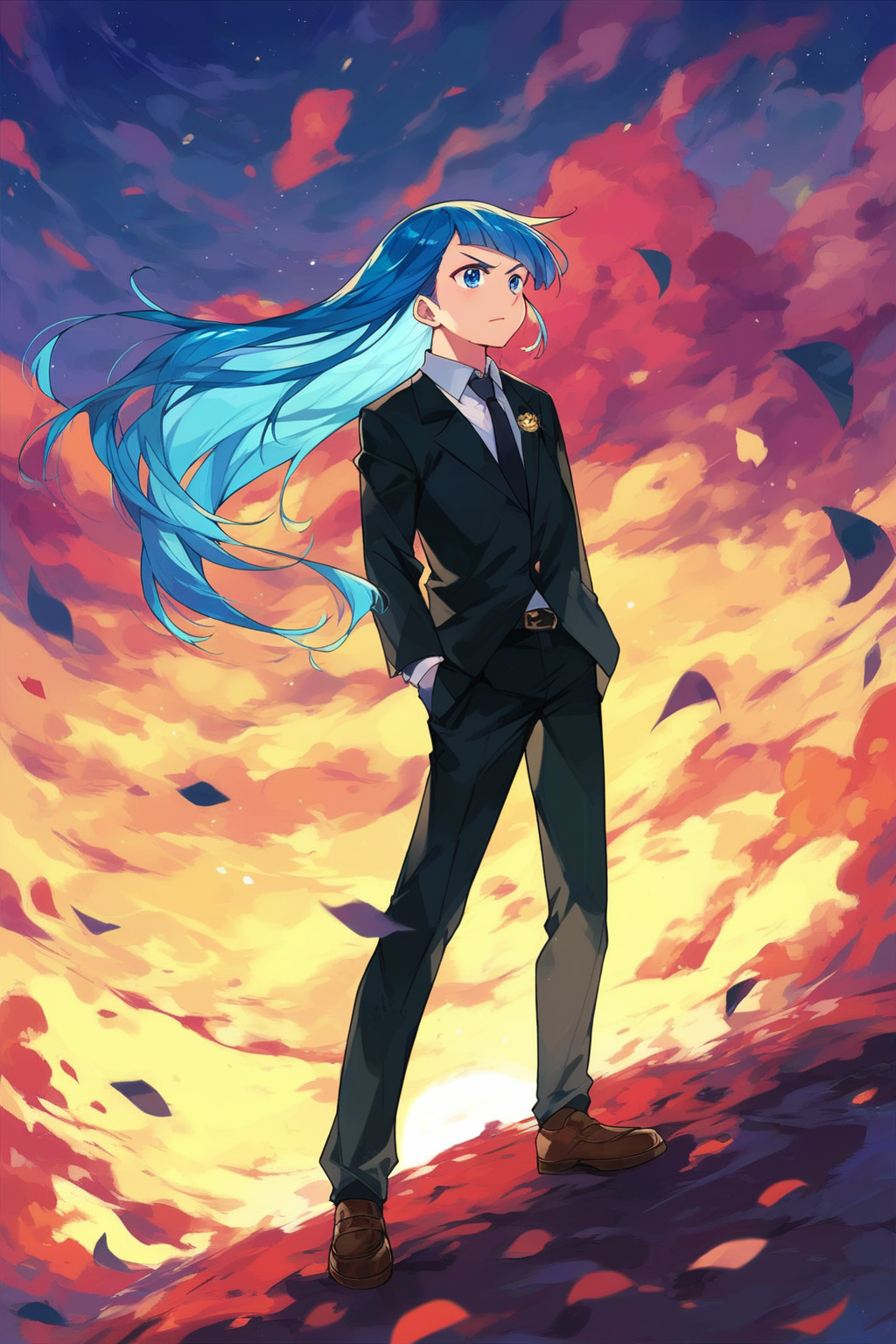 프롬프트: Miwa_JJK, 파란 머리카락, 넥타이, 카타나, 검은 정장, 남색 눈, 갈색 신발, 창백한 피부, 비대칭 앞머리, 긴 머리카락, 검은 넥타이,