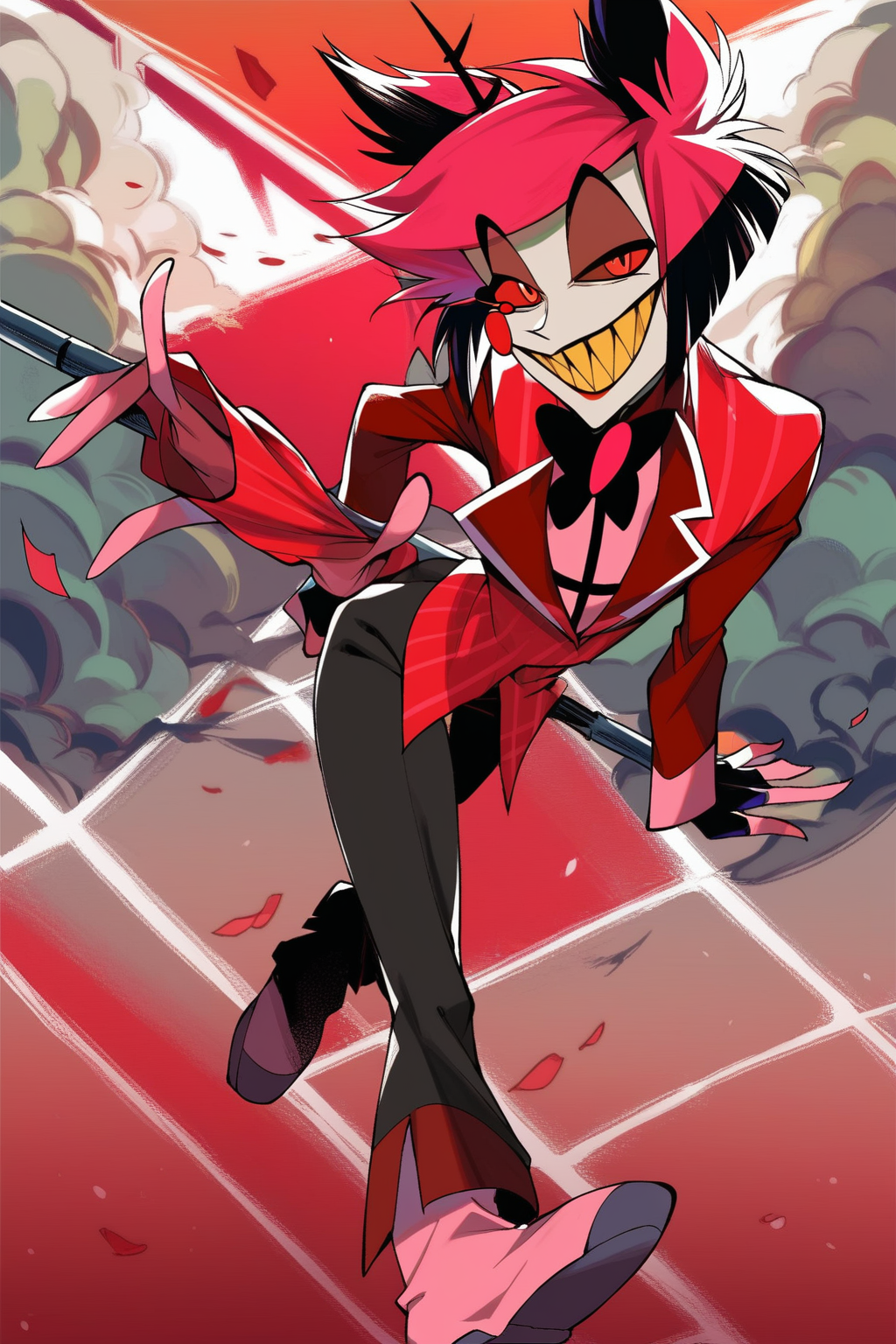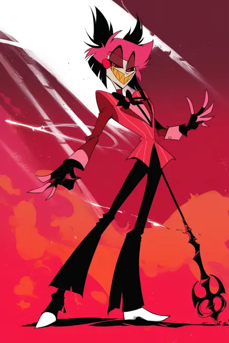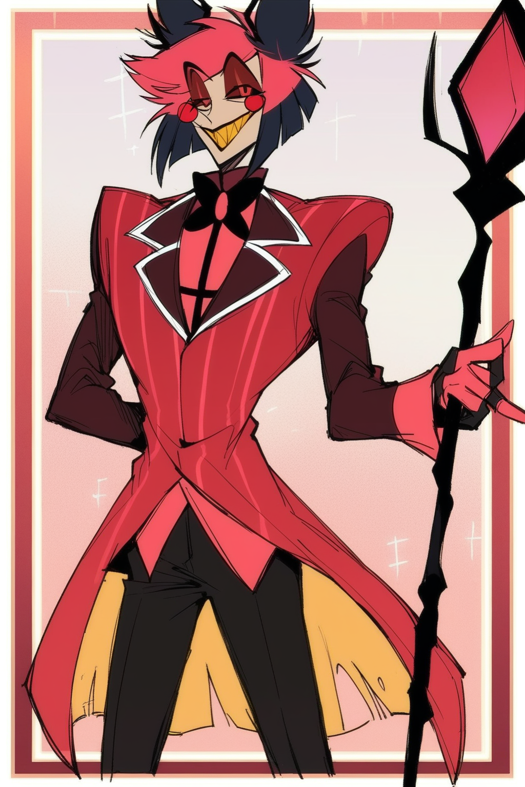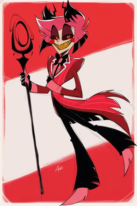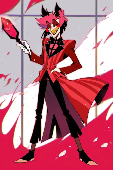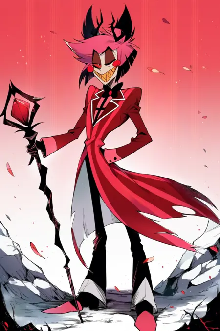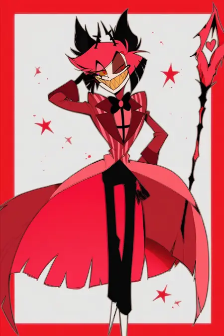 提示词:Alastor(《Hazbin Hotel》),红发,红眼,红色西装,尖牙,微笑,手杖,权杖,黄牙,角,苍白皮肤,纤细,黑色裤子,