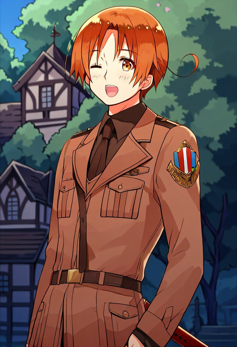 1boy, necktie, belt, solo, one eye closed, = =, ahoge, military, closed eyes,brown hair,Amber eyes