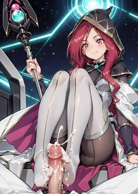 It is prompt: (cyberse witch.1girl.red eyes.red hair.long hair.silver armor,silver cape,red cape,Silver armor boots.thighhighs, , black hood)staff(Staff. Holding)
