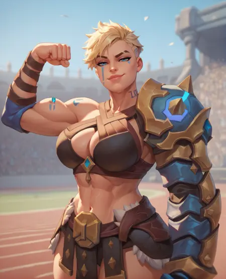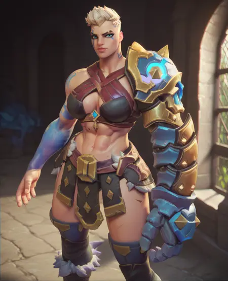 한쪽 장갑, 가슴 노출, 미니스커트, 갑옷, 허벅지 긴 양말,