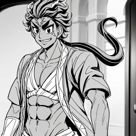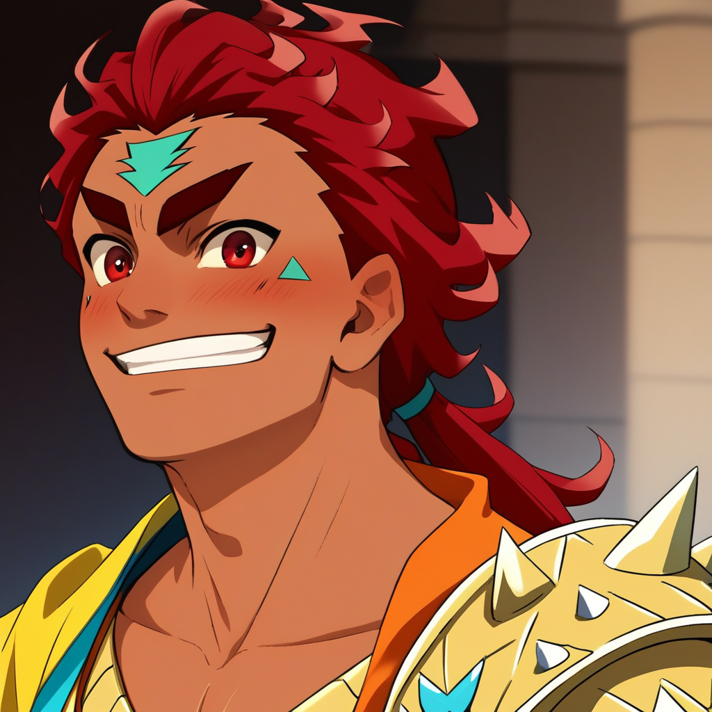 Base: 1boy,solo,male,handsome,bara,muscular,smile,grin,rashad,facial marks,forehead mark,red hair,low ponytail,dark skin,red eyes,collarbone, (alt trigger words: loose hair)