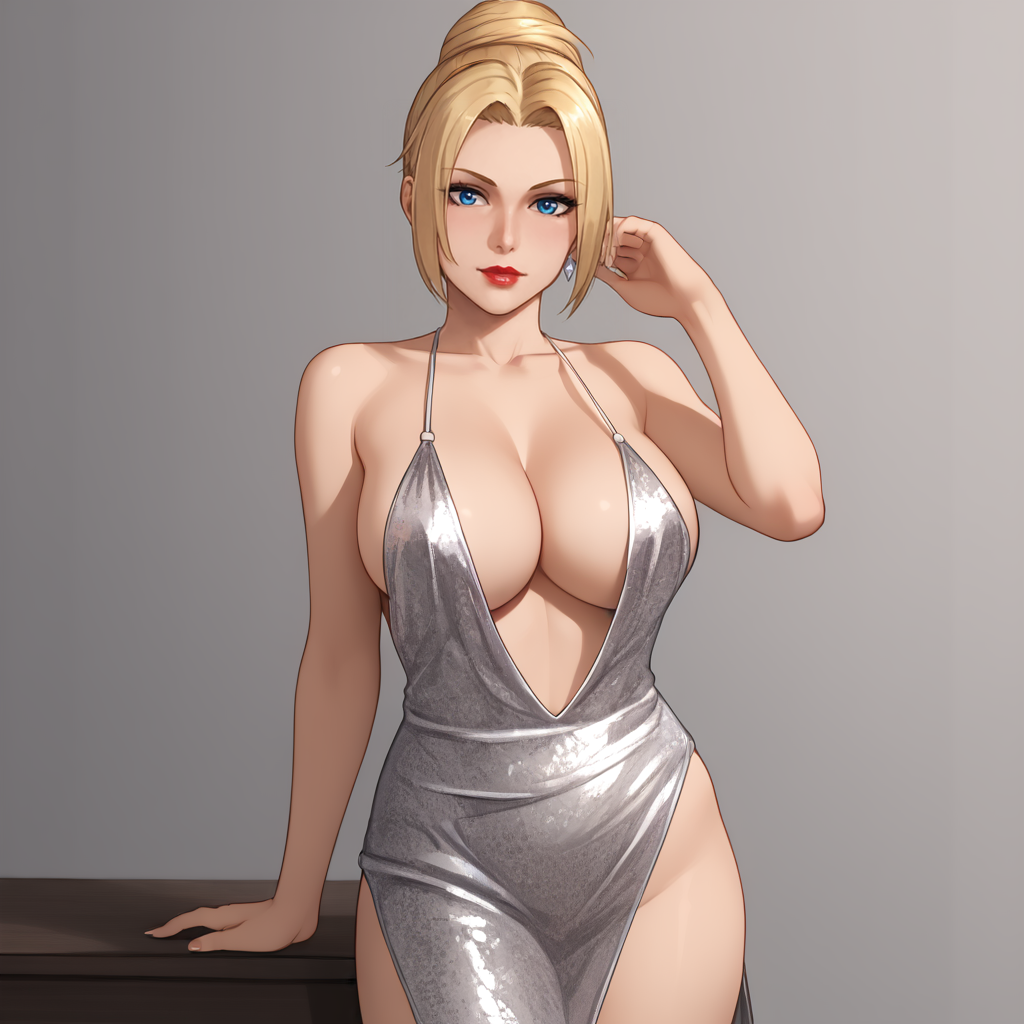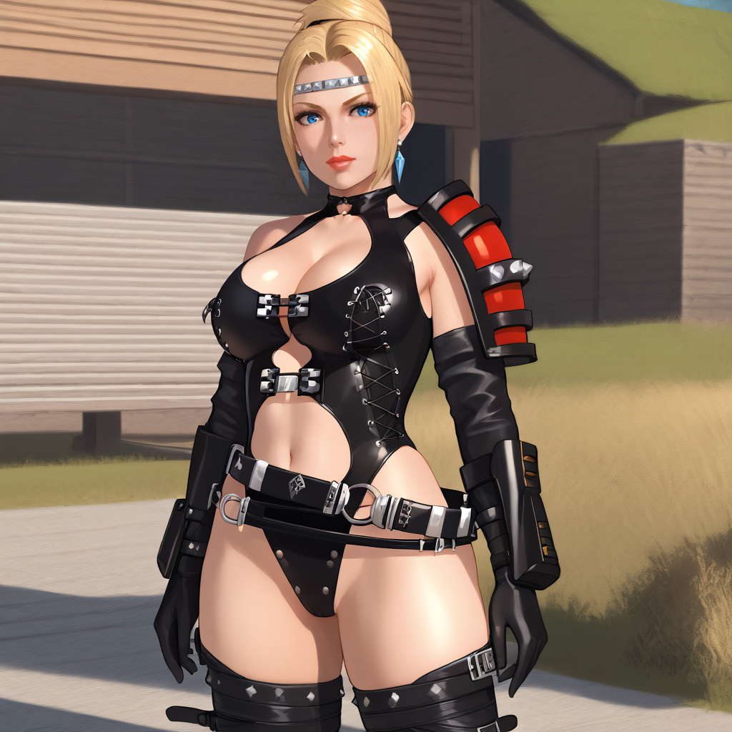 触发词:RachelNinjaGaiden, 1girl, 大胸部, 金发, 饰品, 耳环, 肘部手套, 蓝眼, 衣服镂空, 过膝袜, 肚脐镂空, 黑色紧身衣, 腰带, 胸部镂空, 肩部护甲, 单发髻, 黑色手套, 头环, 乳房分开, 嘴唇