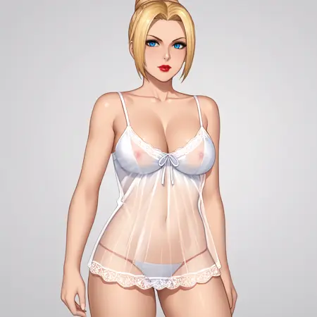 带比基尼的触发词:RachelBikiniNinjaGaiden, 1girl, 单人, 泳装, 白色比基尼, 大胸部, 金发, 眼镜, 蓝眼, 马尾, 肚脐, 胸部露出, 无肩带比基尼, 红唇, 长发, 侧系式比基尼下装, 前系式上装, 口红, 妆容, 锁骨