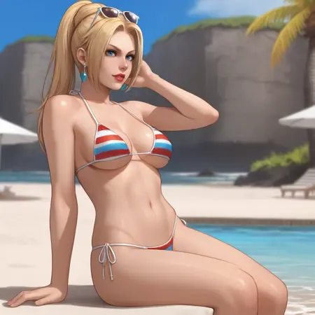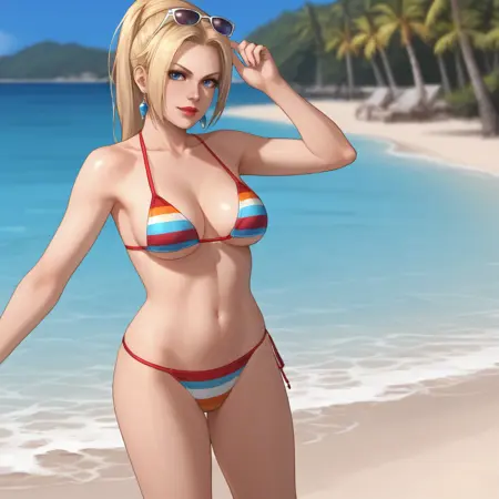 带彩色比基尼的触发词:RachelBikiniNinjaGaiden, 1girl, 泳装, 太阳镜, 金发, 耳环, 饰品, 条纹比基尼, 眼镜戴在头上, 蓝眼, 中等胸部, 长发, 肚脐, 下胸露, 马尾, 口红, 嘴唇
