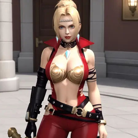 RachelRedNinjaGaiden, 1girl, 饰品, 耳环, 大胸部, 金发, 腰带, 手链, 胸部露出, 短发