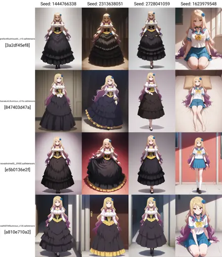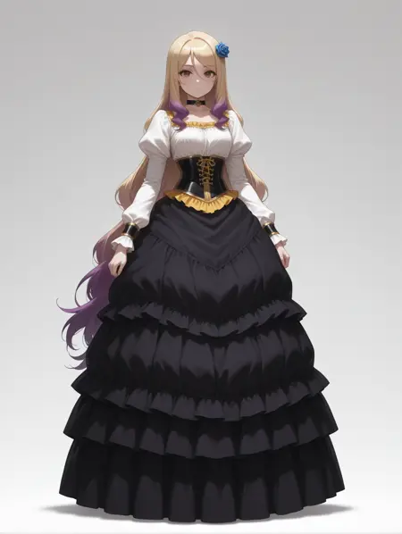 1女孩,lora:IL-Quele:0.8,长发,发饰,多色发,金发,紫发,棕眼,蓝玫瑰,项圈,腕带,大胸