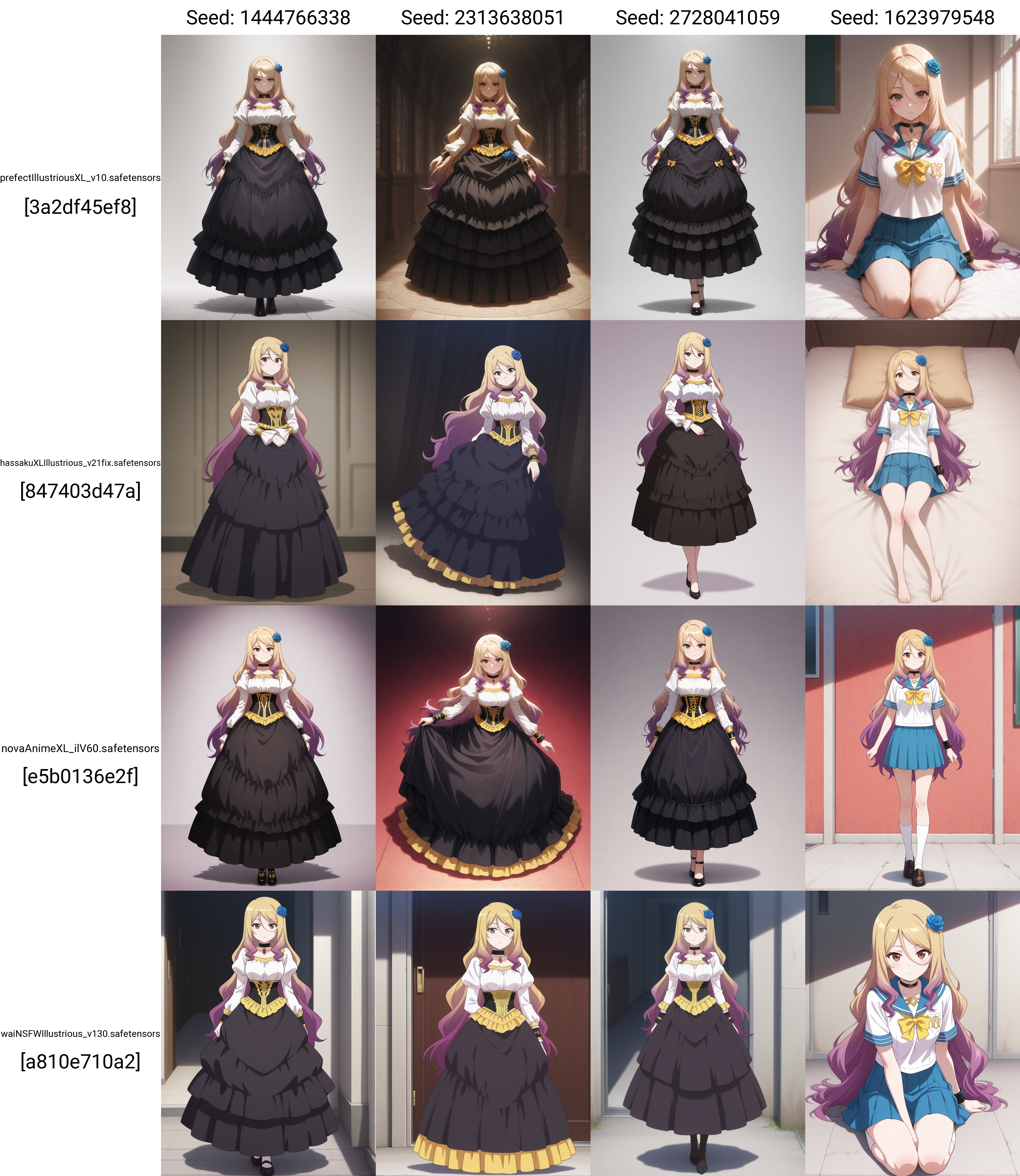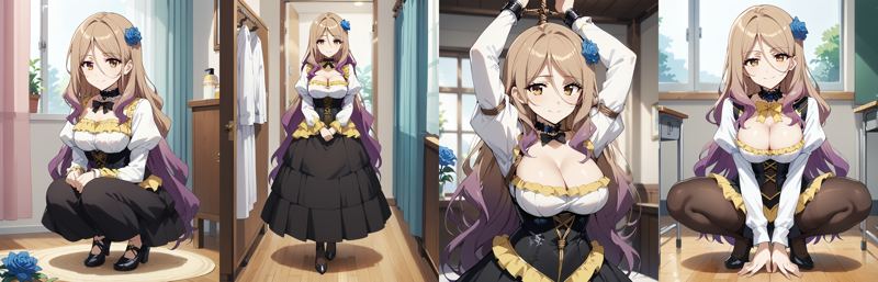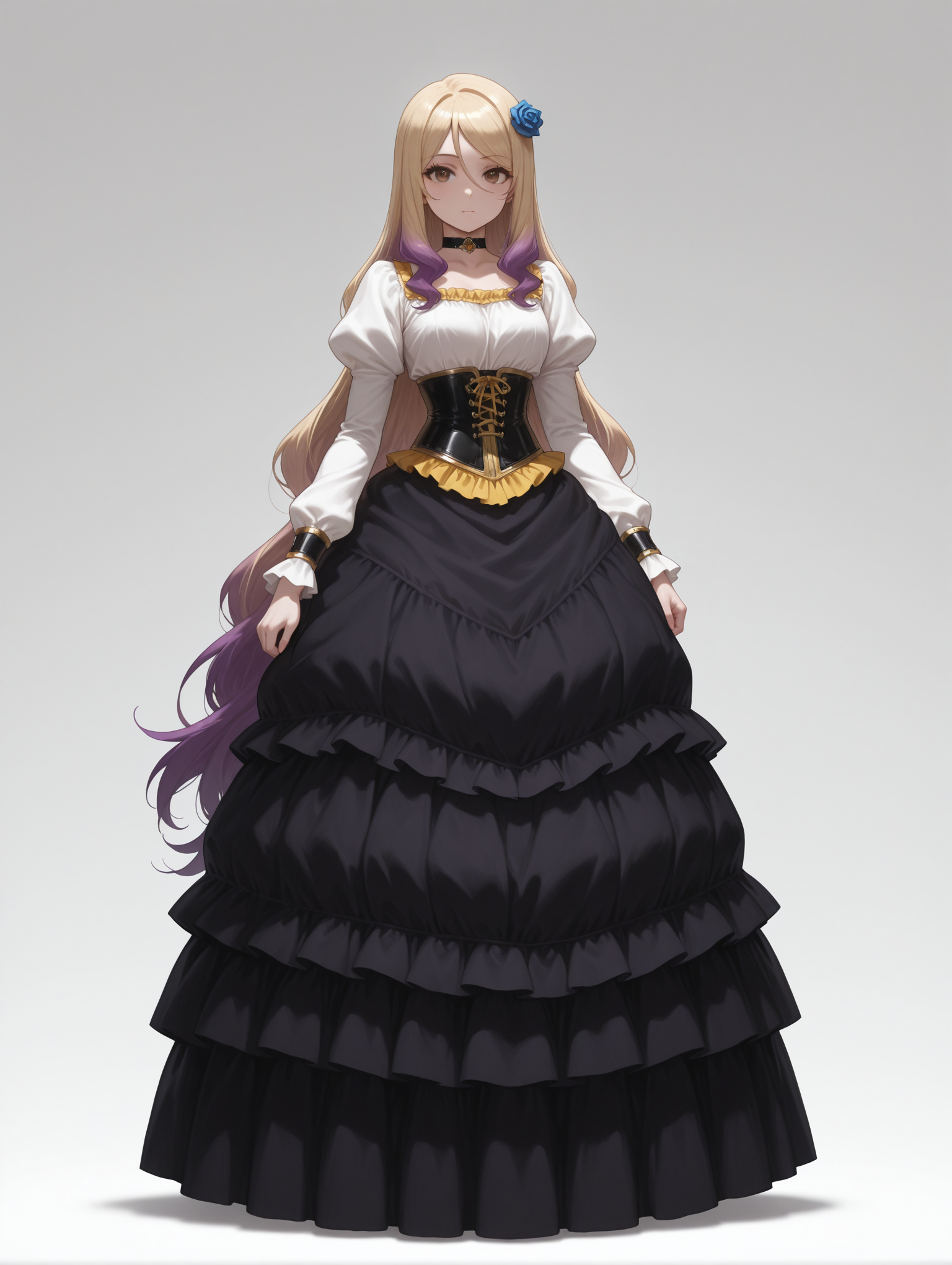 1girl, lora:IL-Quele:0.8 ,long hair,hair ornament,multicolored hair,blonde hair,purple hair,brown eyes,blue rose,choker, wristband,large breasts