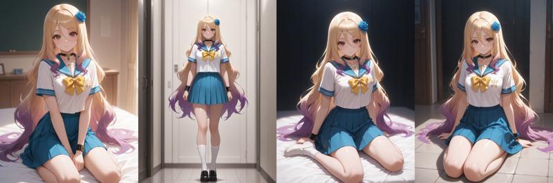 QueleSUniform,school uniform,yellow bow,short sleeves,blue skirt,white shirt,jewelry,pleated skirt,blue sailor collar