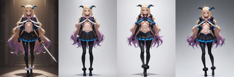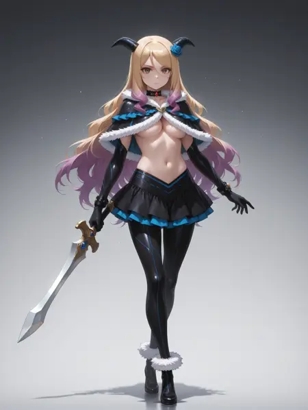 QueleShinigami,horns,fur trim,pantyhose,capelet,skirt,underboob,black elbow gloves,jewelry{,holding sword|}