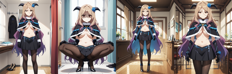 horns,black skirt,black capelet,underboob,navel,gloves,black elbow gloves,midriff,high heel boots,white fur trim,black high heels,blue lines