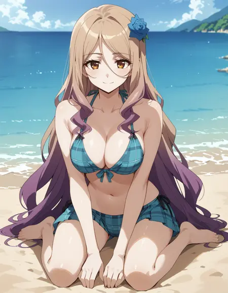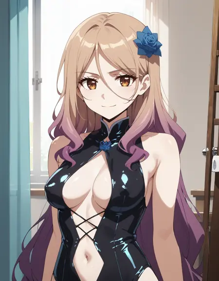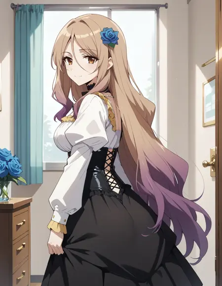 1소녀, lora:IL-Quele:0.8, 긴 머리, 머리 장식, 다색 머리, 금발 머리, 보라색 머리, 갈색 눈, 파란 장미, 목걸이, 팔찌, 큰 가슴