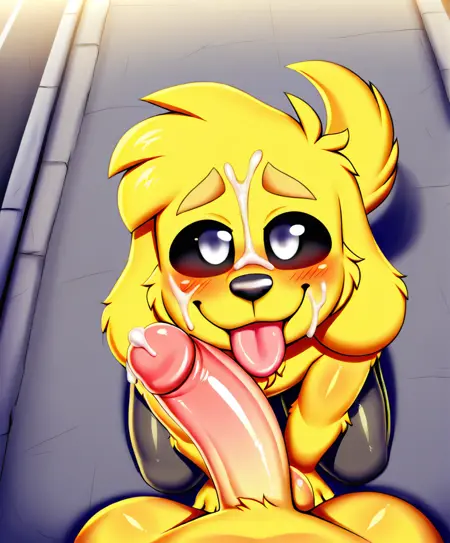 mikecrack, solo, looking at viewer, blush, smile, blonde hair, 1boy, animal ears, tail, black eyes, shiny skin, furry,dog ears, dog tail, black sclera, body fur, animal nose