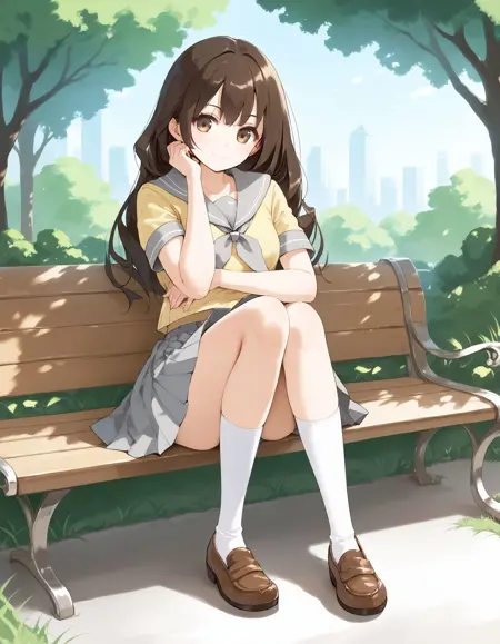 为体现她的典型形象,添加“灰色水手领、灰色领巾、黄色水手服、裙子、袜子、船鞋”。