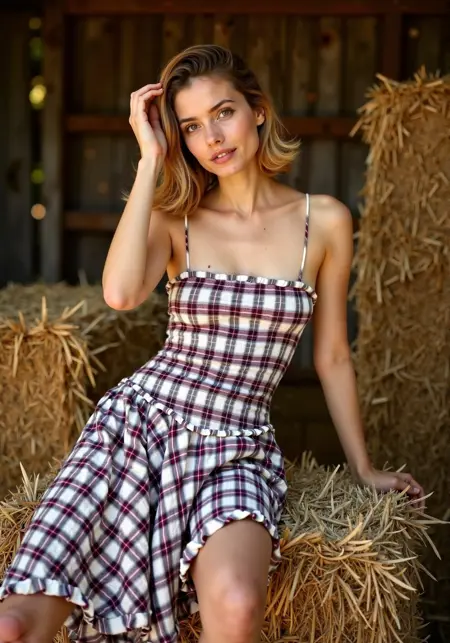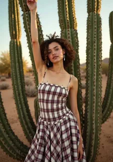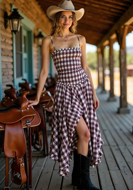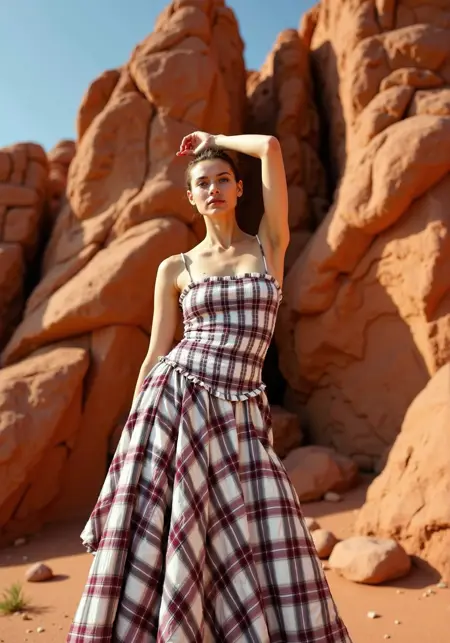 无肩带、及膝连衣裙,裙摆呈喇叭状。裙子采用白色、棕色和红色的格子图案。