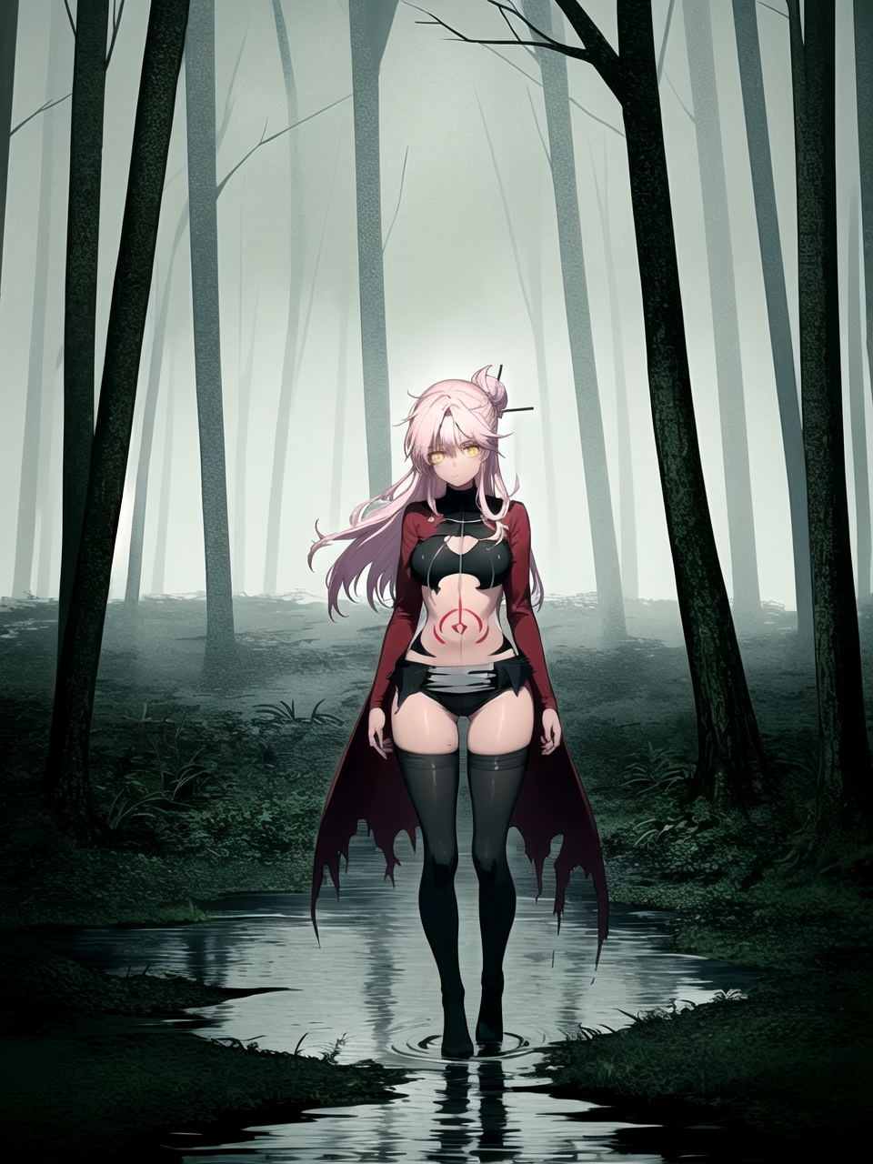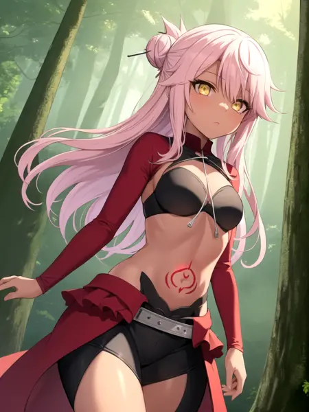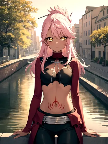 Base Outfit: chloebase, pink hair, long hair, hair bun, hairpin, yellow eyes, dark skin, dark-skinned female, long sleeves, stomach tattoo, midriff, waist cape