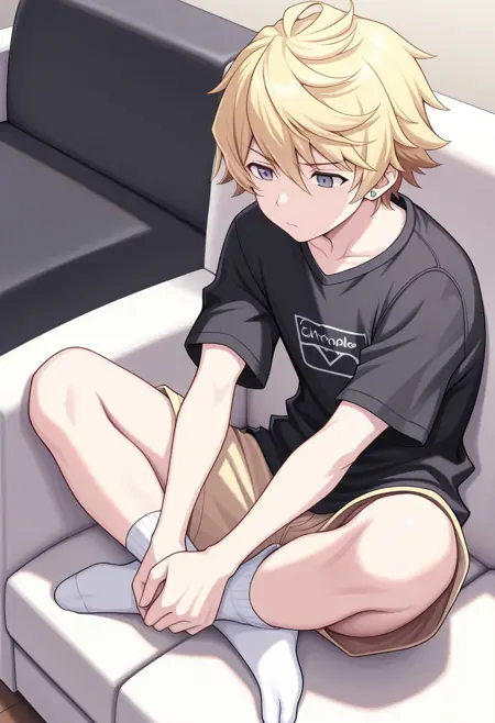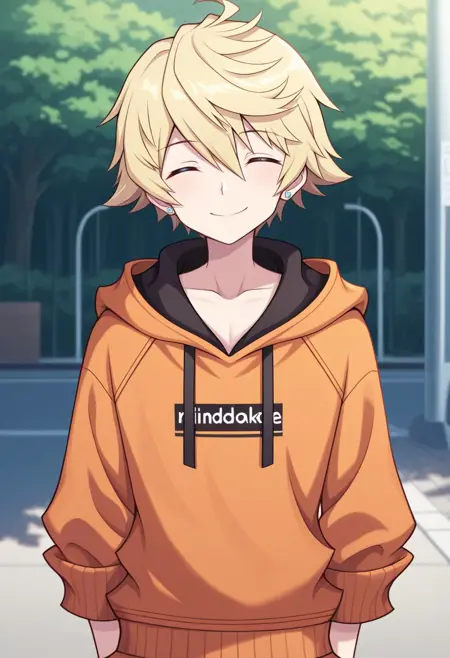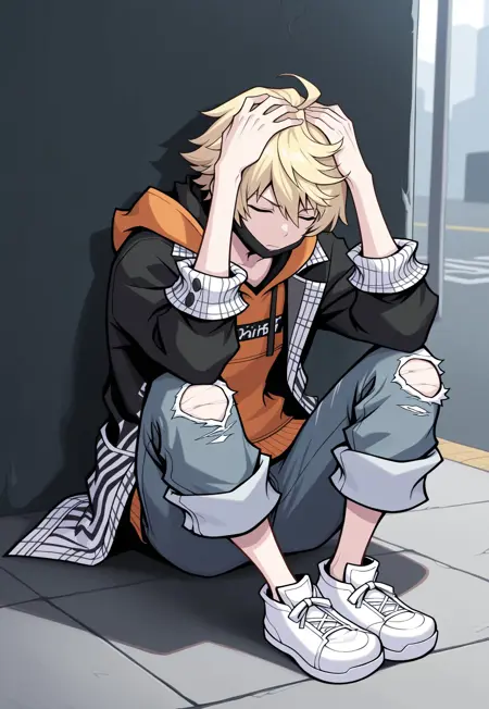 rindokanade, 1boy, male focus, solo, grey eyes, blonde hair, jewelry, earrings, mouth mask, mask pull, hoodie, orange hoodie, coat, black and white coat, open coat, jeans, torn jeans, pants rolled up, shoes, sneakers, white footwear