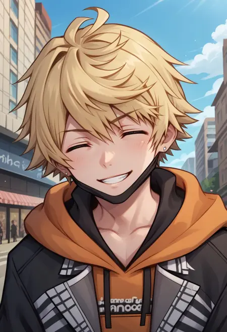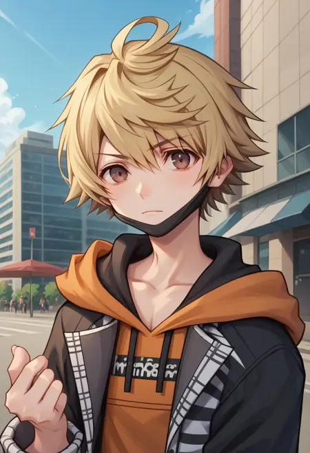 rindokanade, 1boy, male focus, solo, grey eyes, blonde hair, jewelry, earrings, mouth mask, mask pull, hoodie, orange hoodie, coat, black and white coat, open coat, jeans, torn jeans, pants rolled up, shoes, sneakers, white footwear