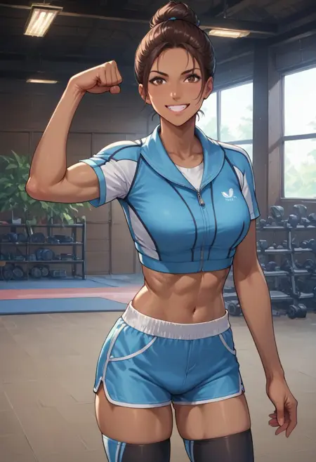 sportswear, crop top, short sleeves, zipper, midriff, shorts, thighhighs, white shoes,