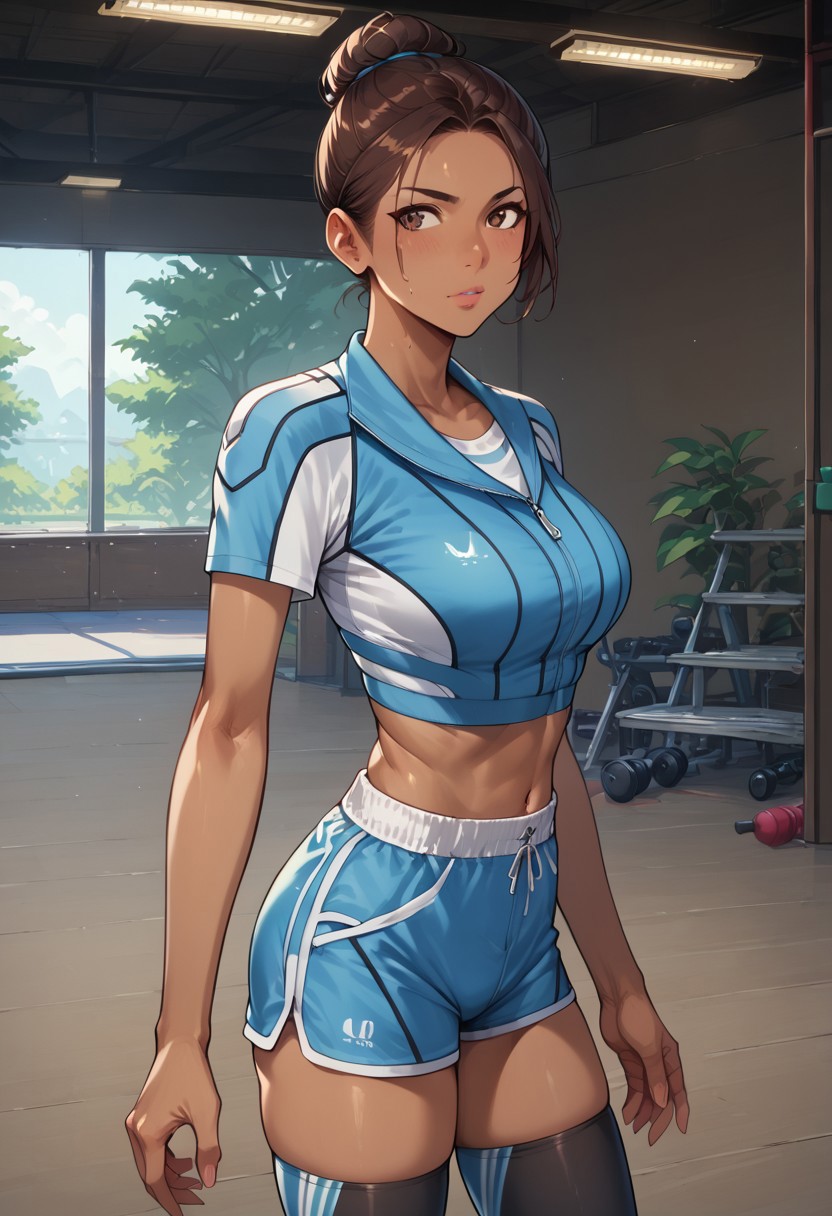 Amina, brown hair, hair bun, tan skin, brown eyes
