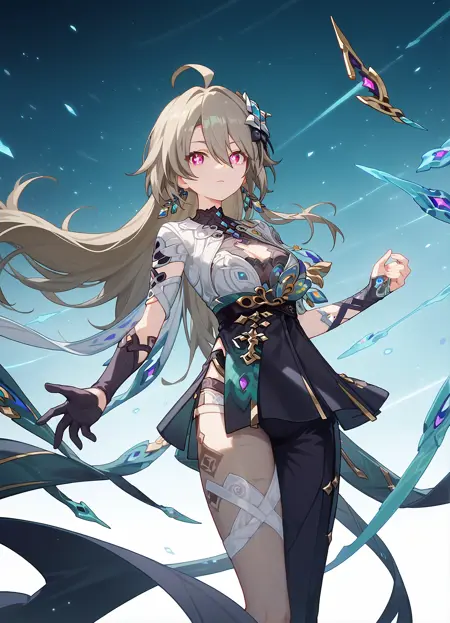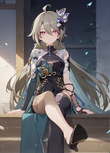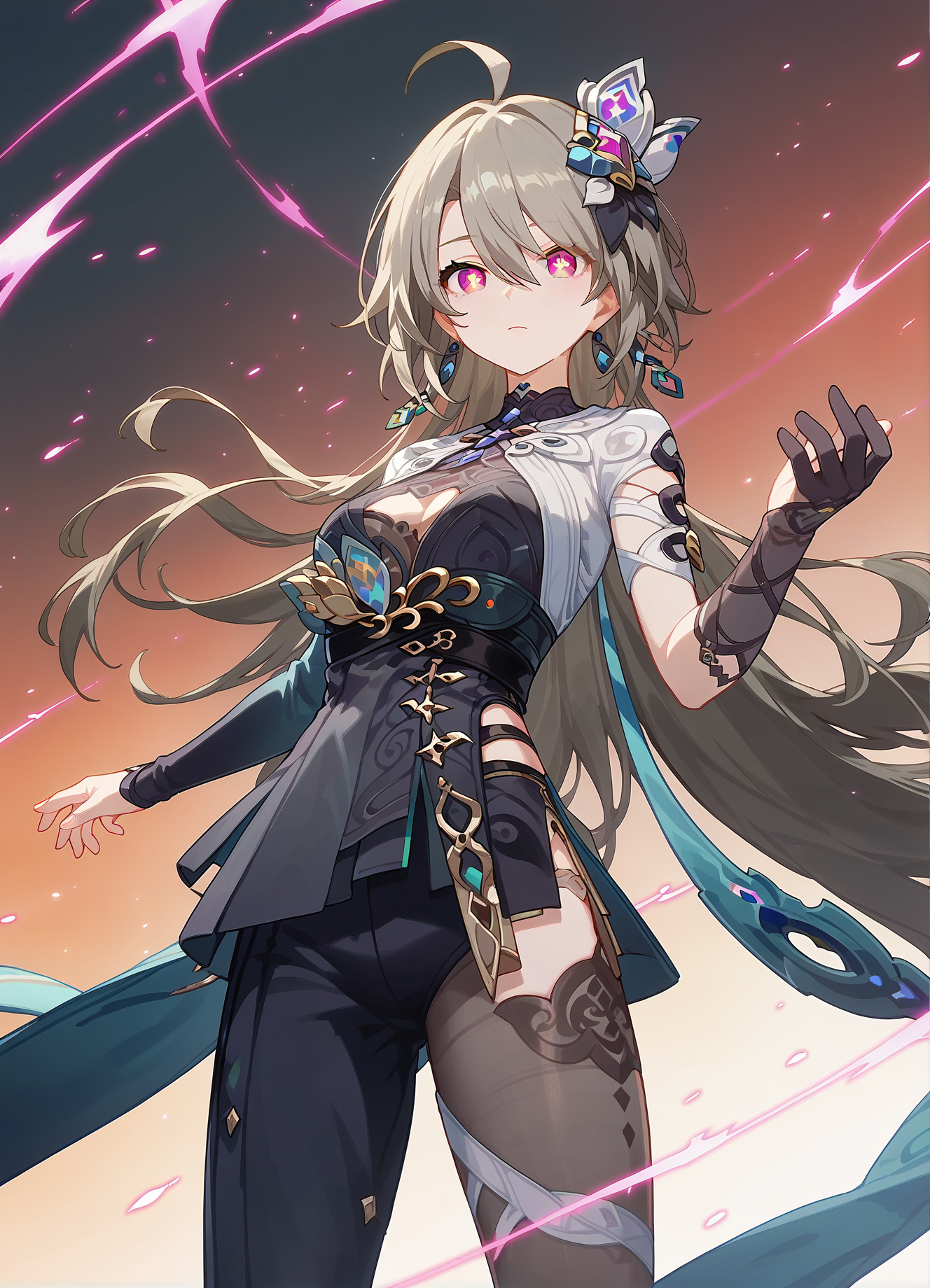 デフォルト: vt_d、グレーの髪、長い髪、あほ毛、前髪、目と目の間の髪、マゼンタ色の瞳、黄色い瞳孔、髪飾り、ドレス、ズボン、黒い靴、ハイヒール、ジュエリー、手袋、片手袋、片方の太ももハイ、胸元、