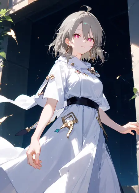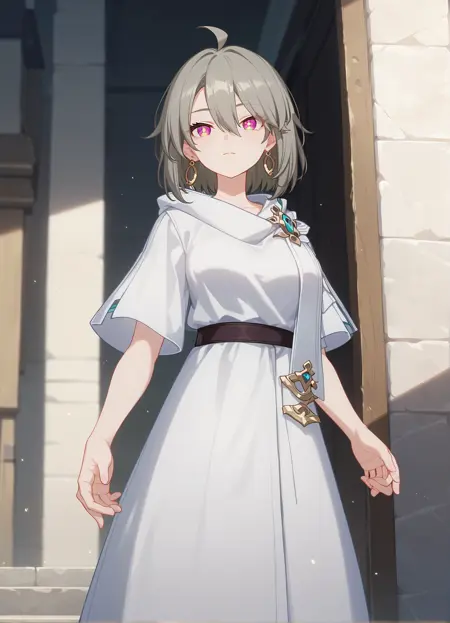 白いローブ:vt_w、グレーの髪、中くらいの髪、あほ毛、前髪、目と目の間の髪、マゼンタ色の瞳、黄色い瞳孔、白いローブ、耳飾り、短めの袖、ブーツ