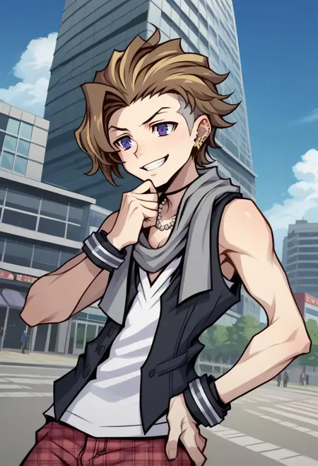 tosaifret, 1boy, male focus, solo, brown hair, blonde hair, multicolored hair, purple eyes, earrings, piercing, ear piercing, scarf, vest, white shirt, sleeveless, jewelry, necklace, wristband, plaid, pants, plaid pants, sneakers, shoes, white footwear,