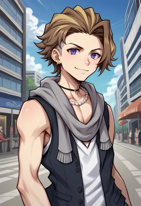 tosaifret, 1boy, male focus, solo, brown hair, blonde hair, multicolored hair, purple eyes, earrings, piercing, ear piercing, scarf, vest, white shirt, sleeveless, jewelry, necklace, wristband, plaid, pants, plaid pants, sneakers, shoes, white footwear,