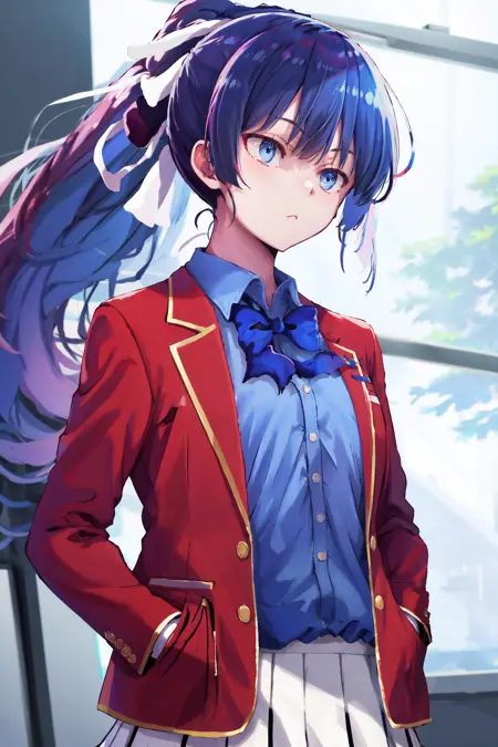 옷 트리거: 학교복 흰 치마 빨간 자켓 파란 셔츠 파란 리본