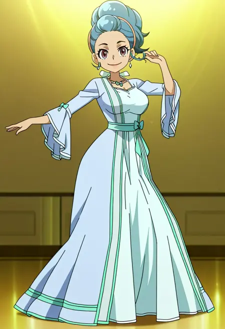 The model includes several outfits: her default outfit, a dress, Arabian-style clothes, and a kimono.