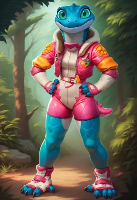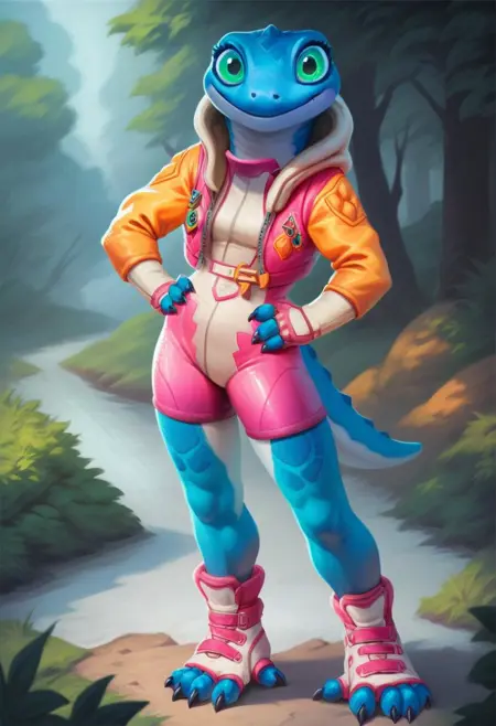태그: "Jazz_HE, 페어리 여성, 녹색 눈, 재킷, 후드, 발톱, 바디수트, 손가락 없는 장갑, 반바지, 파란 피부, 꼬리, 신발, 날카로운 이빨"