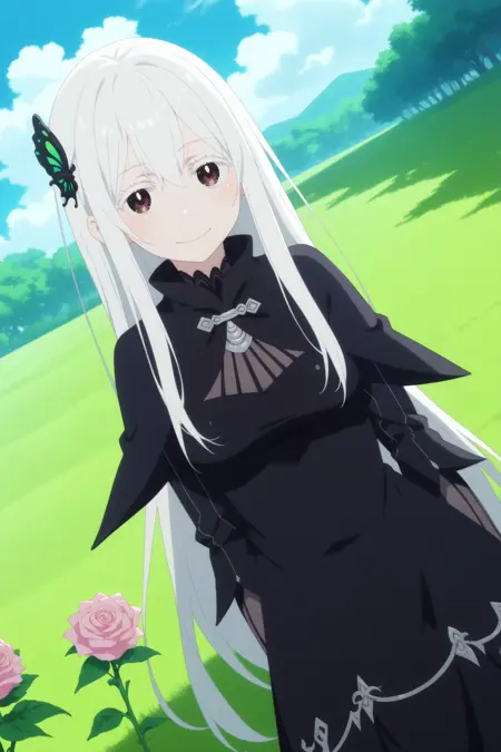 トリガー:1girl,solo,echidna,long hair,hair ornament,butterfly hair ornament,colored eyelashe,hair between eyes,capelet,dress,black dress,breasts
