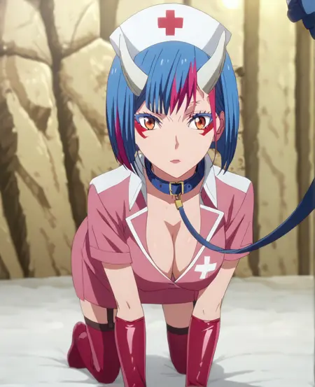 <lora:gabwa-07:1>, gabwa, 短い髪, 青い髪, 角, ピンクの髪, ストライプ入り髪, 化粧, 顔の模様, ボブカット, アイシャドウ, オニの角, 色付き肌, 色付きまつげ, オレンジ色の目,