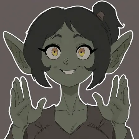 1girl, Edda_(Undergroundj), goblin, yellow eyes, ponytail, green skin, pointy ears, brown shirt,