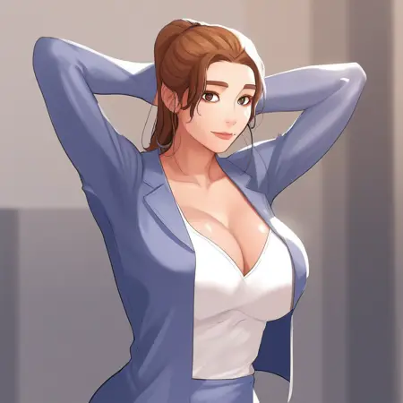 16. ((formal, sexy long-sleeves blue jacket, white top, obscene cleavage, huge cleavage, sexy blue pencil skirt, ))