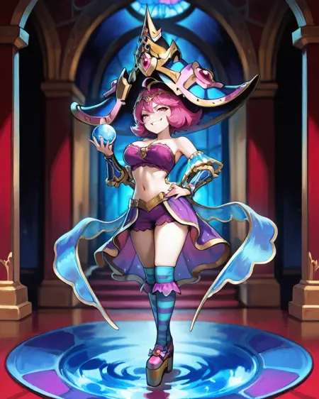• 伟大全知 Sae:saealt, 1girl, 粉色头发, 短发, ahoge, 粉色眼睛, 翅膀, 帽子, 王冠帽, 悬浮王冠, 悬浮王冠帽, 头饰, 发圈, 宝石, 粉色宝石, 裸露肩膀, 臂环, 褶边臂环, 护臂, 蓝色护臂, 管状上衣, 紫色管状上衣, 腹部, 肚脐, 紫色裙子, 裙下短裤, 紫色短裤, 条纹, 水平条纹长筒袜, 过膝袜, 台阶鞋, 鞋子,
