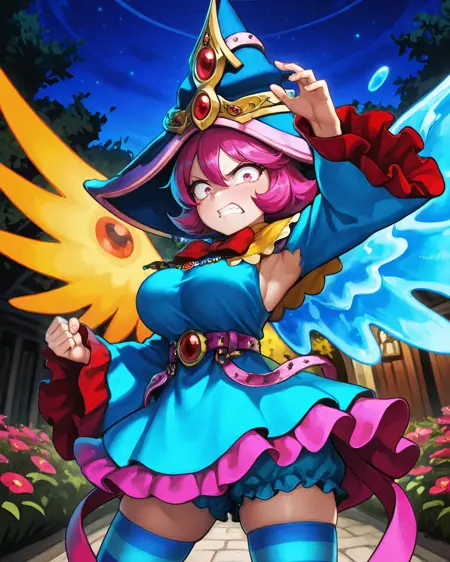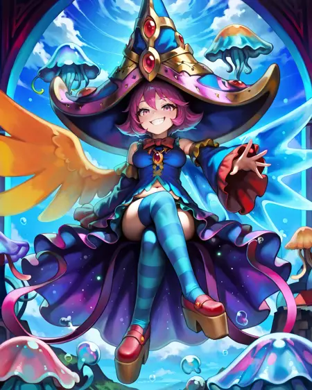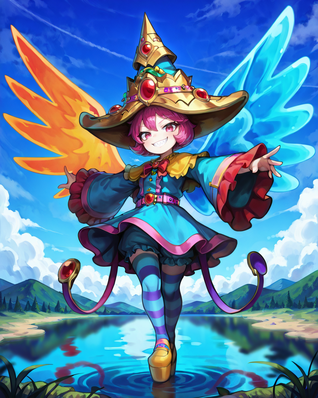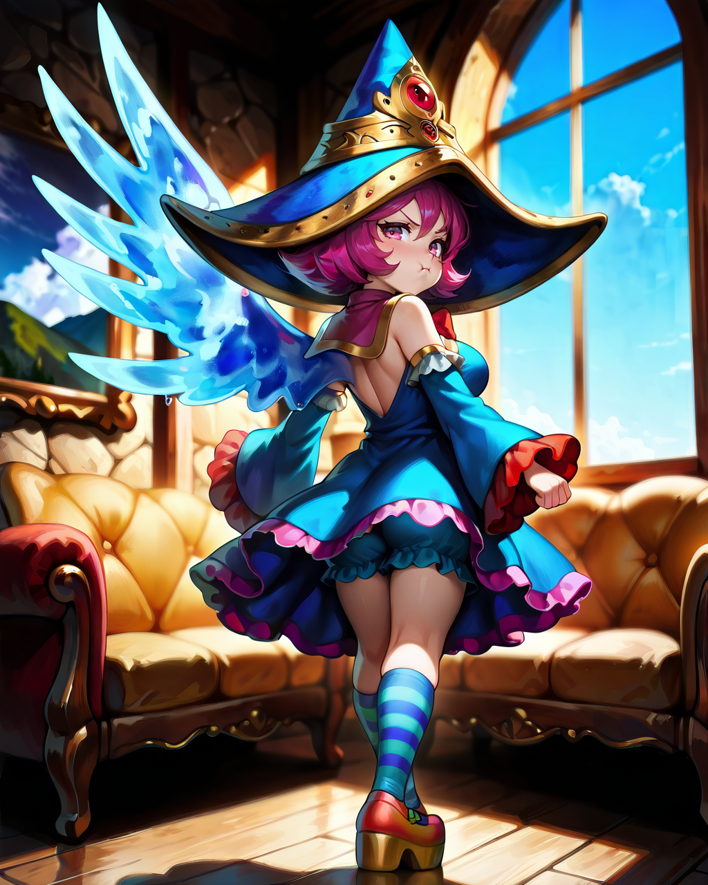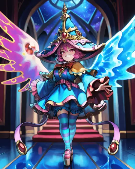 • 深渊之翼 Sae:saebase, saedef, 1girl, 粉色头发, 短发, 粉色眼睛, 不对称翅膀, 不匹配翅膀, 液态翅膀, 蓝色翅膀, 两只翅膀, 翅膀, 帽子, 王冠帽, 黄色短披肩, 项链, 宝石, 红色宝石, 红色蝴蝶结, 连衣裙, 蓝色连衣裙, 褶边连衣裙, 多层连衣裙, 条纹, 水平条纹长筒袜, 条纹长筒袜, 连裤袜, 宽袖, 长袖, 褶边袖, 蓝色短裤, 粉色腰带, 紫色丝带, 台阶鞋,