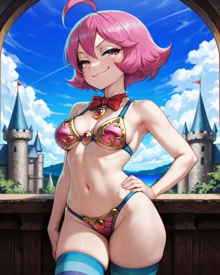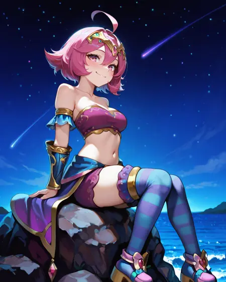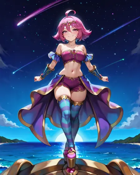 • 伟大全知 Sae:saebase, saealt, 1girl, 粉色头发, 短发, ahoge, 粉色眼睛, 发圈, 眉间头发, 锁骨, 褶边臂环, 裸露肩膀, 护臂, 蓝色护臂, (紫色短裤), 无肩带管状上衣, 金属管状上衣, (金色镶边紫色管状上衣), (腰间披风), 紫色披风, 腹部, 肚脐, 水平条纹长筒袜, 条纹, 台阶鞋, 鞋子