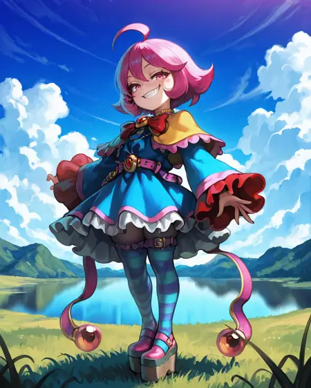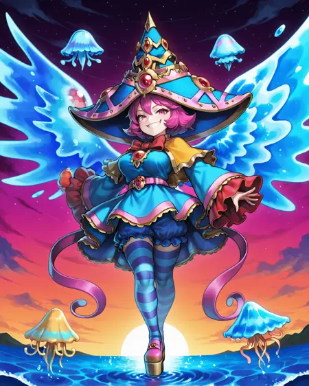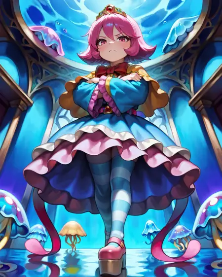 • 凯瑟里深渊 Sae:saebase, saedef, 1girl, 粉色头发, 短发, 粉色眼睛, 不对称翅膀, 不匹配翅膀, 液态翅膀, 翅膀, 帽子, 王冠帽, 披肩, 项链, 宝石, 红色宝石, 红色蝴蝶结, 连衣裙, 蓝色连衣裙, 无袖连衣裙, 肚脐, 褶边连衣裙, 多层连衣裙, 条纹, 水平条纹长筒袜, 过膝袜, 宽袖, 分离式袖子, 褶边袖, 蓝色短裤, 紫色丝带, 台阶鞋, 鞋子,