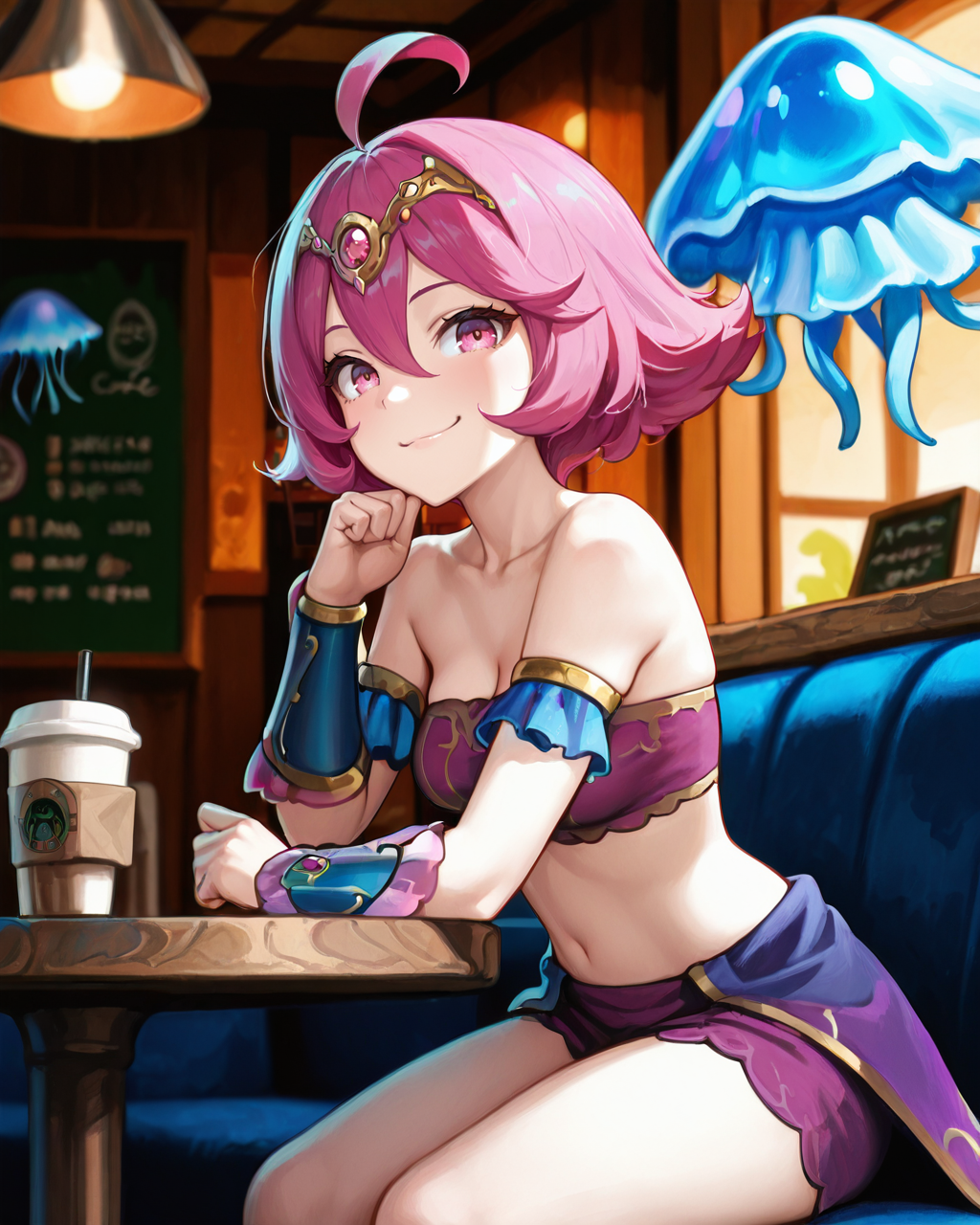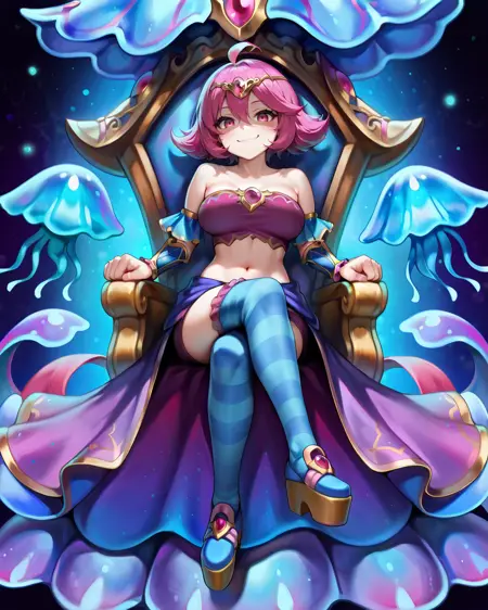 - 随机其他标签:漂浮水母, 水母, 坐姿, 透视裙底, 交叉双腿, 坐在水母上, 坐在球体上, 握紧双手, 手托下巴,